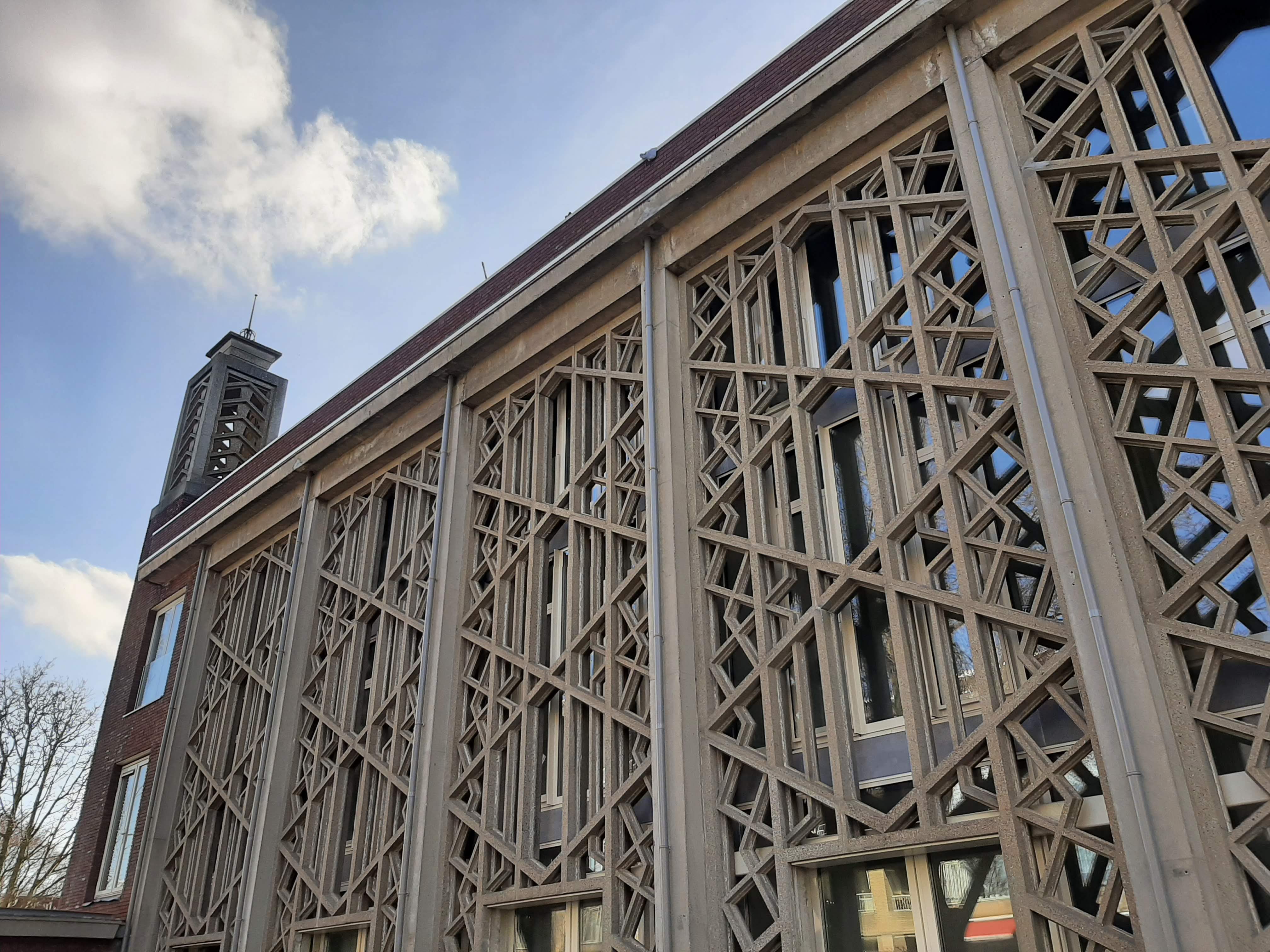 Het kerkgebouw dateert uit de jaren 50 en is opgebouwd uit betonnen elementen en bakstenen. Kenmerkend zijn de betonnen ramen die in diagonale vlakken verdeeld zijn. Het valt in de categorie wederopbouwarchitectuur wat hedendaags meer waardering krijgt.