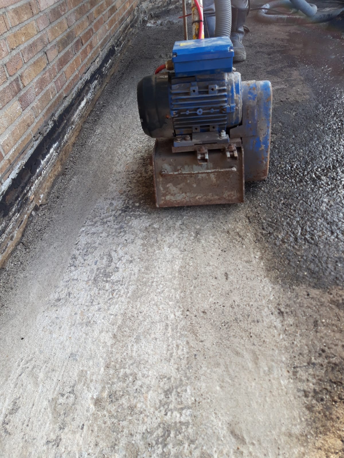 Nadat het verouderde vloersysteem is verwijderd, hebben wij de constructievloer, door middel van licht frezen, voorzien van de juiste oppervlakte reinheid en textuur voor de basis van het nieuwe systeem. Het nieuwe vloersysteem bestaat uit een cementdekvloer op afschot met een langs gevel goot en een vloercoating systeem, ook zijn alle bestaande HWA’s verwijderd en vervangen.