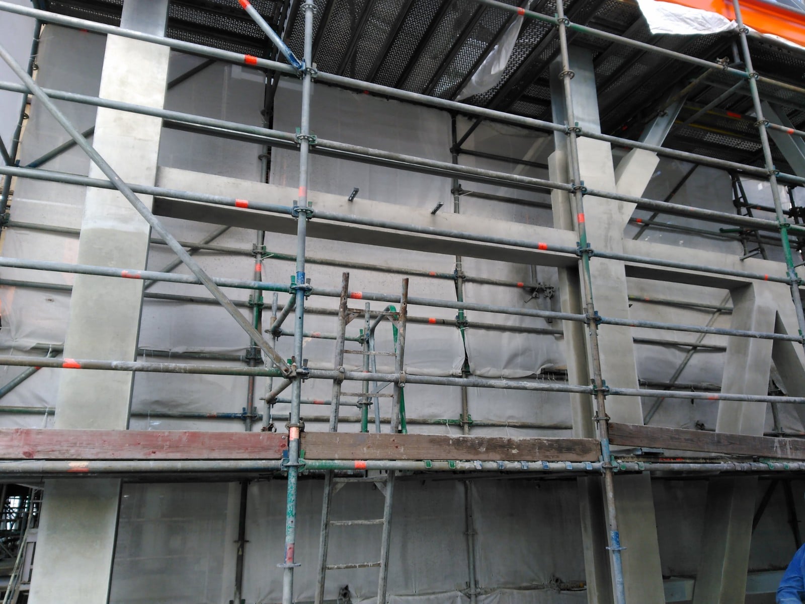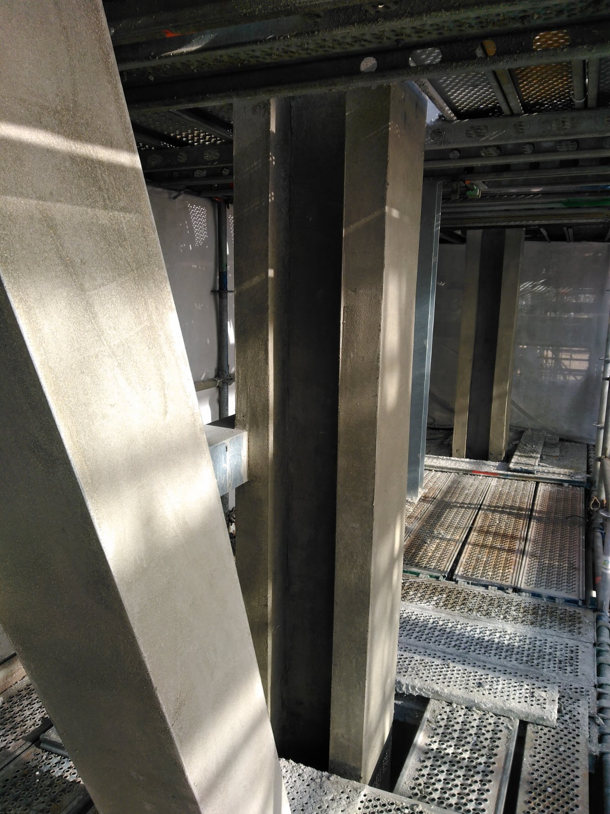 Eerst moest alles afgeplakt worden om de nieuwe constructie te beschermen. De kolommen hebben we voorzien van gaas en hoekprofielen. Dit alles profielvolgend, wat het er niet eenvoudiger op maakte.